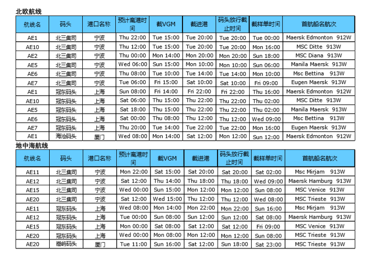 新东西向航线网络截港及海运指示截至时间表(第二版)