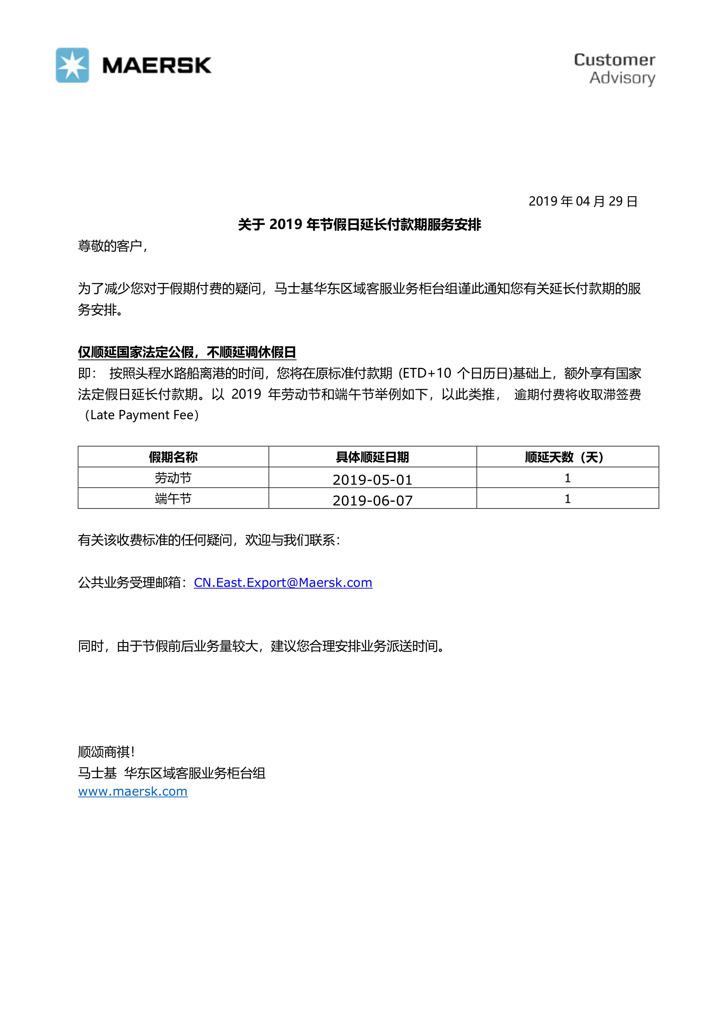 MSL - (华东)关于 2019 年节假日延长付款期服务安排-劳动节端午节