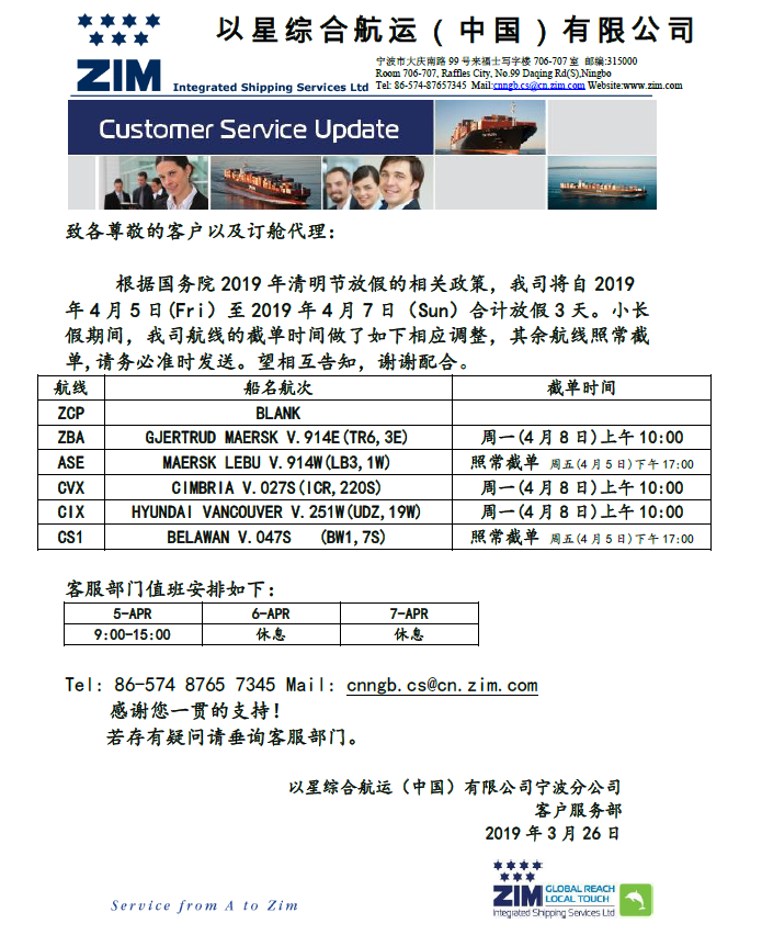 ZIM - 关于2019年清明节放假截单时间和值班安排的通知